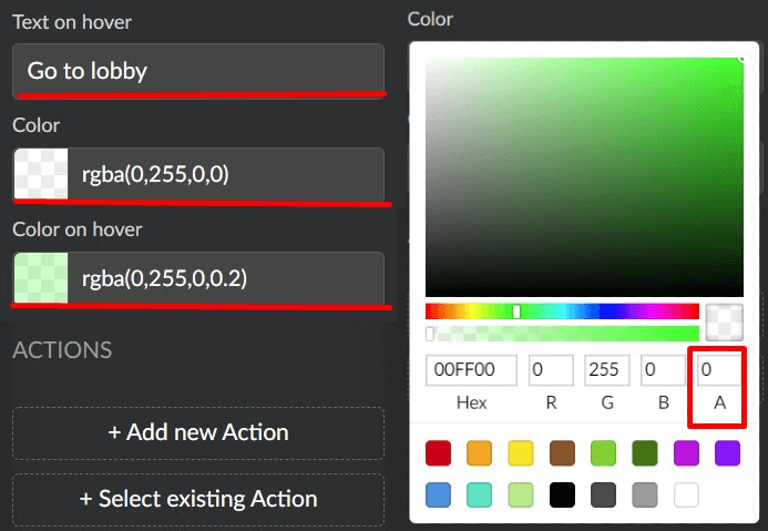 Обратите внимание, что четвертая цифра в rgba отвечает за прозрачность объекта (0 для настроек цвета, 0.2 для настроек цвета по ховеру в данном примере). Для того чтобы открыть меню выбора цвета нажмите на строку с настройками. Вы также можете вставить Hex код оттенка для точности.
