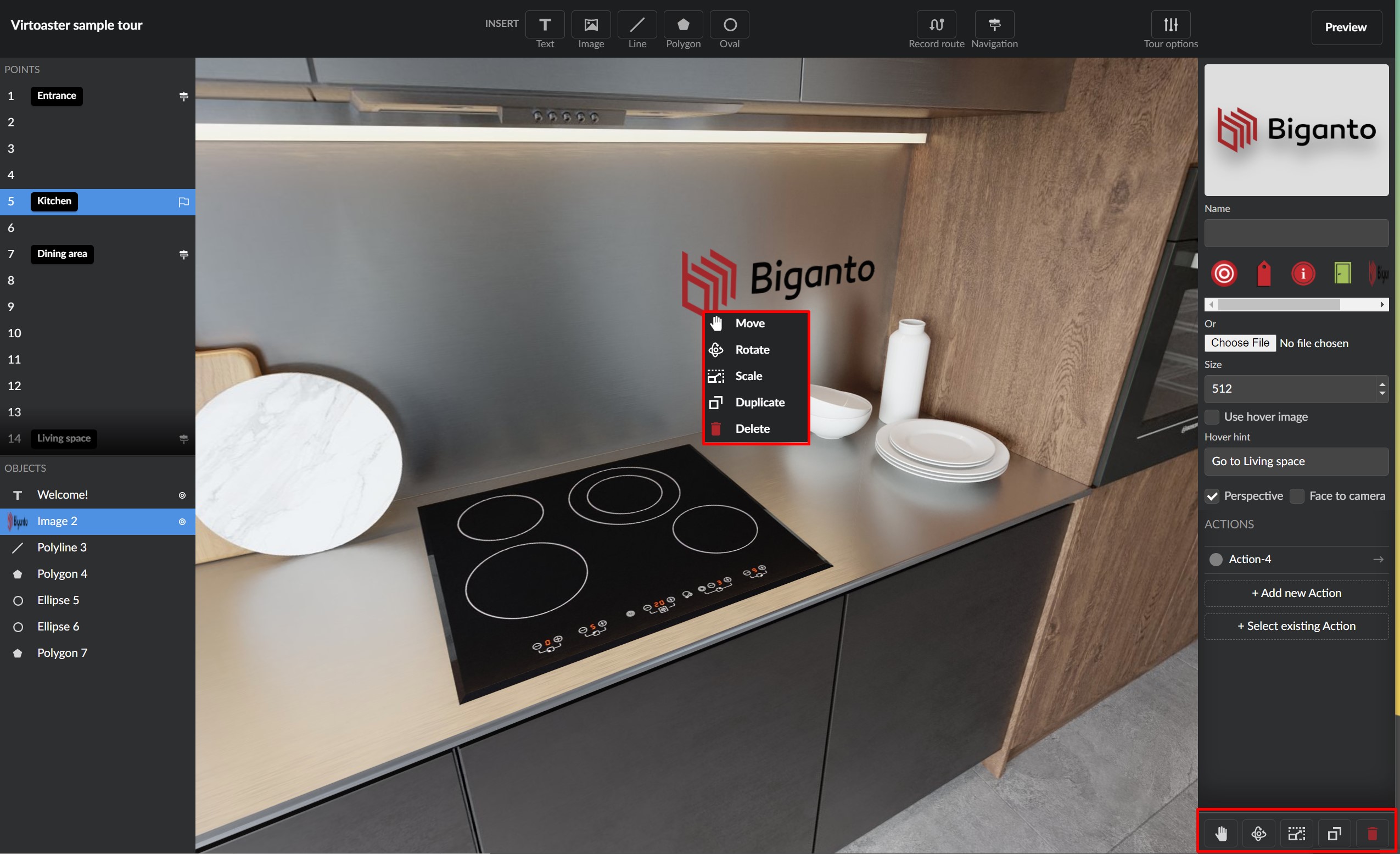 - Используйте левую кнопку мыши, чтобы редактировать свойства объекта, добавить действия, видео, изображения и т.д.