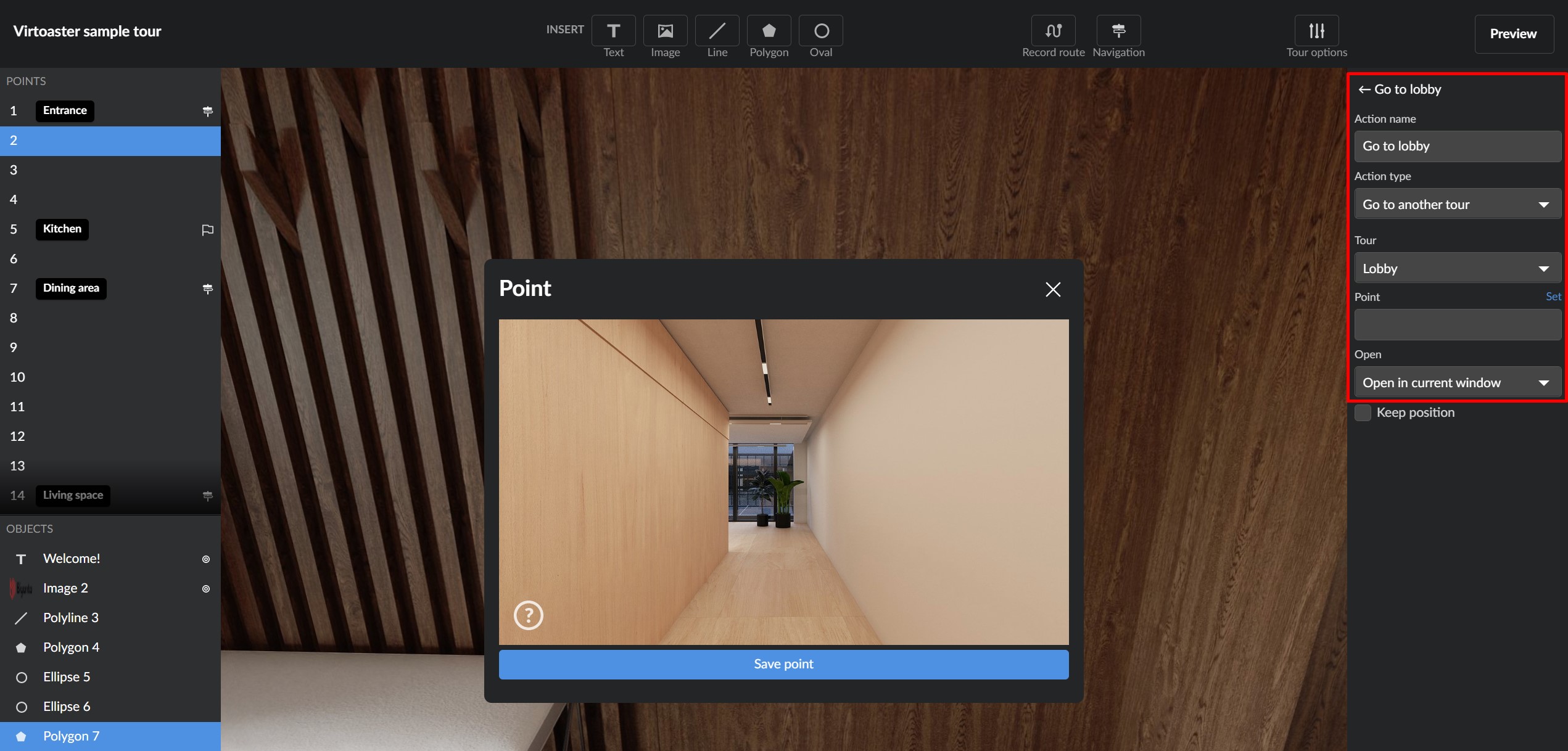 Позволяет осуществить переход в другой тур в вашем аккаунте. Выберите тур из списка, перейдите в точку, в которую вы хотите переходить и где в браузере вы хотите осуществлять переход (новое\текущее окно).