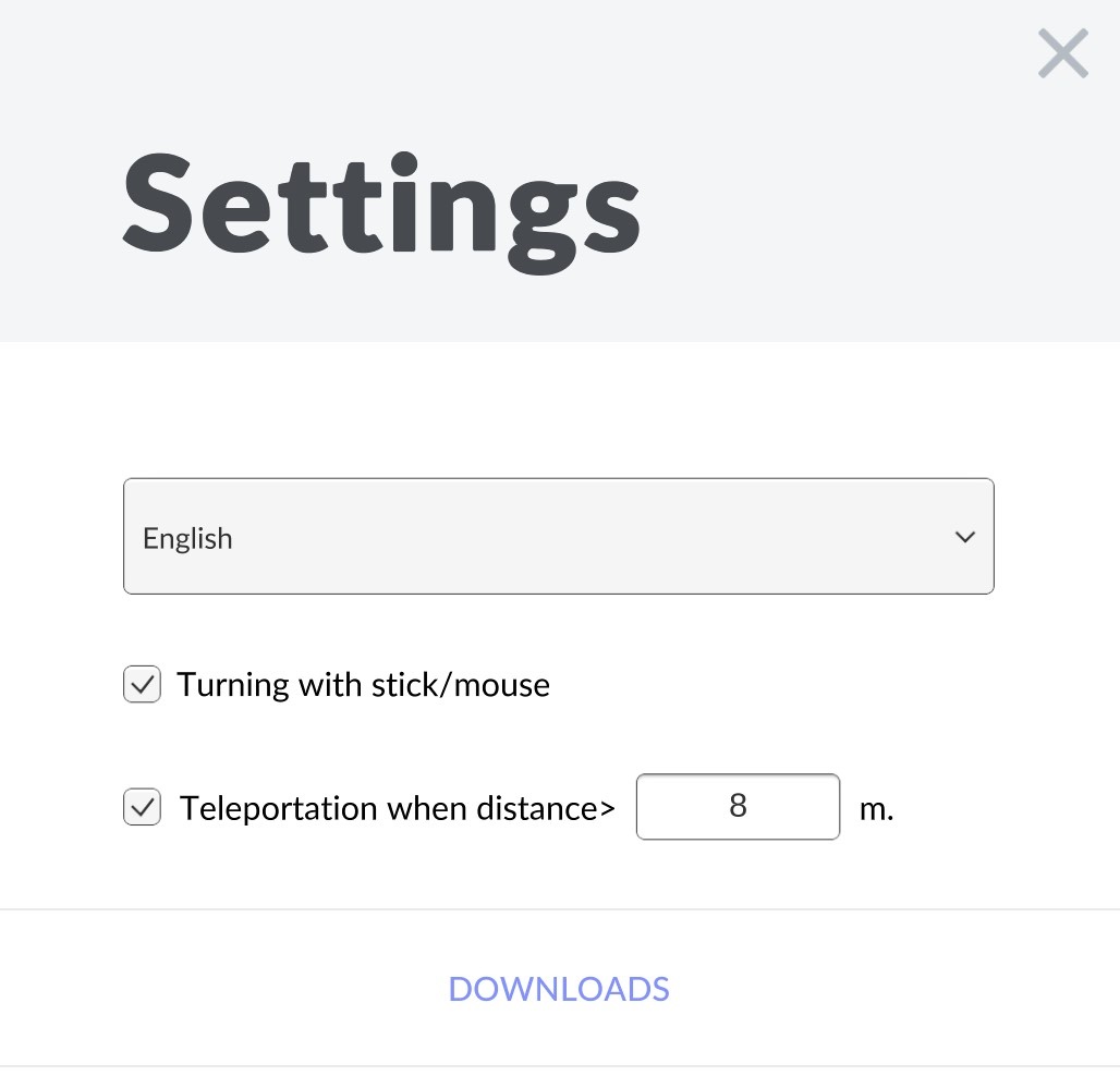 Вы можете получить доступ к настройкам плеера нажав в правом верхнем углу. Здесь вы можете сменить пользователя, язык, управлять загруженными турами и изменить некоторые настройки воспроизведения.