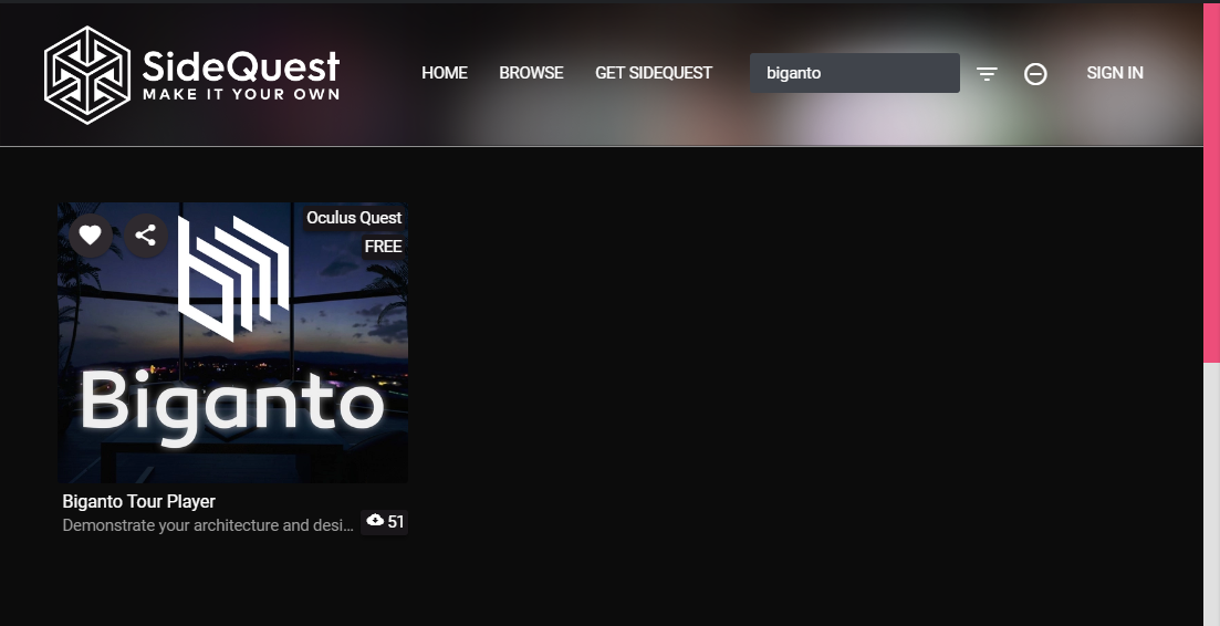После установки SideQuest и выполнения всех необходимых инструкций вы можете скачать приложение Biganto из маркета приложений SideQuest.