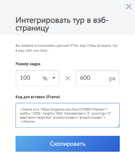 По нажатию на кнопку будет сгенерирован код. Вы можете изменить размер окна, в котором будет показан тур, что будет отражено в iFrame коде.